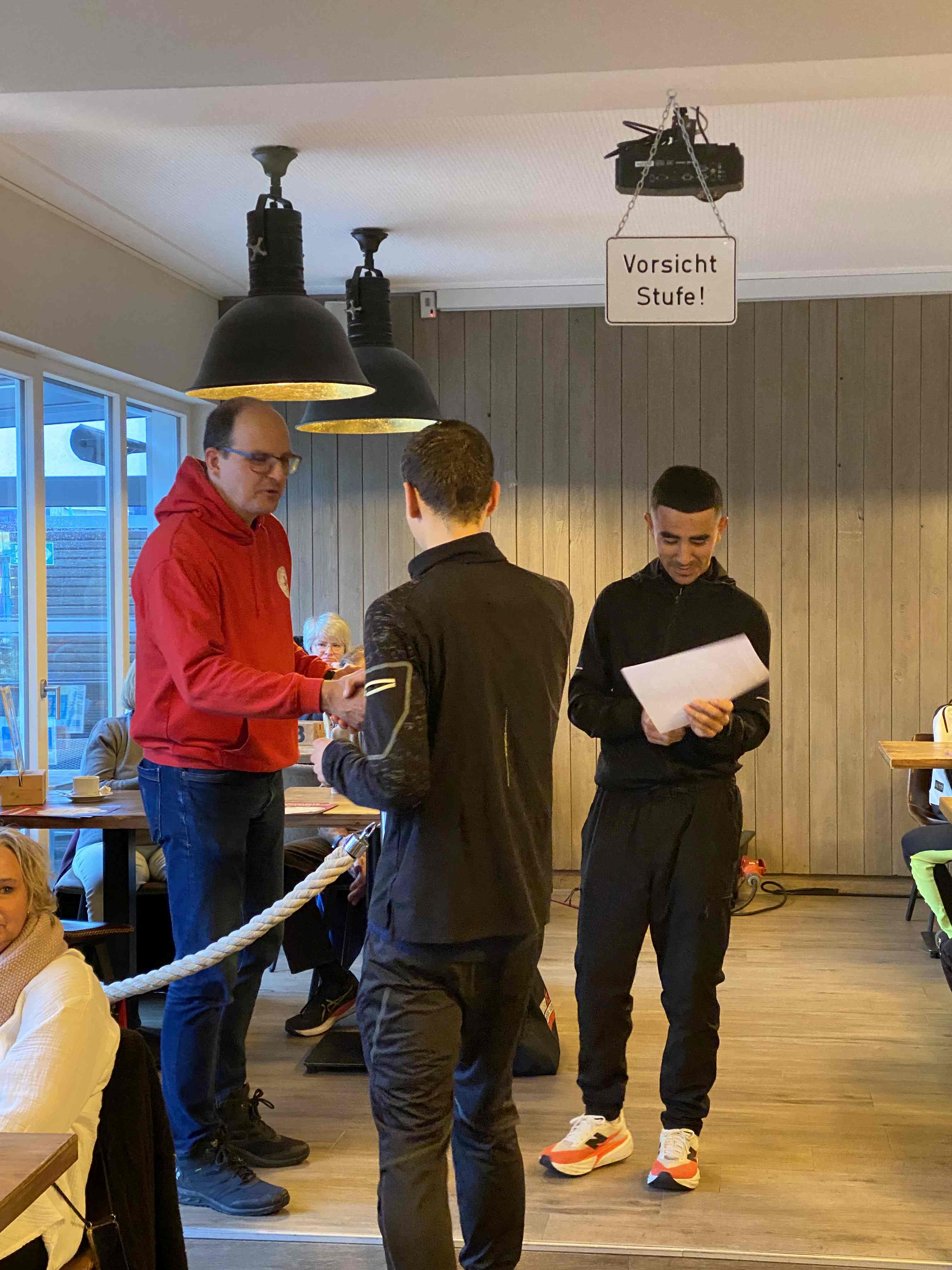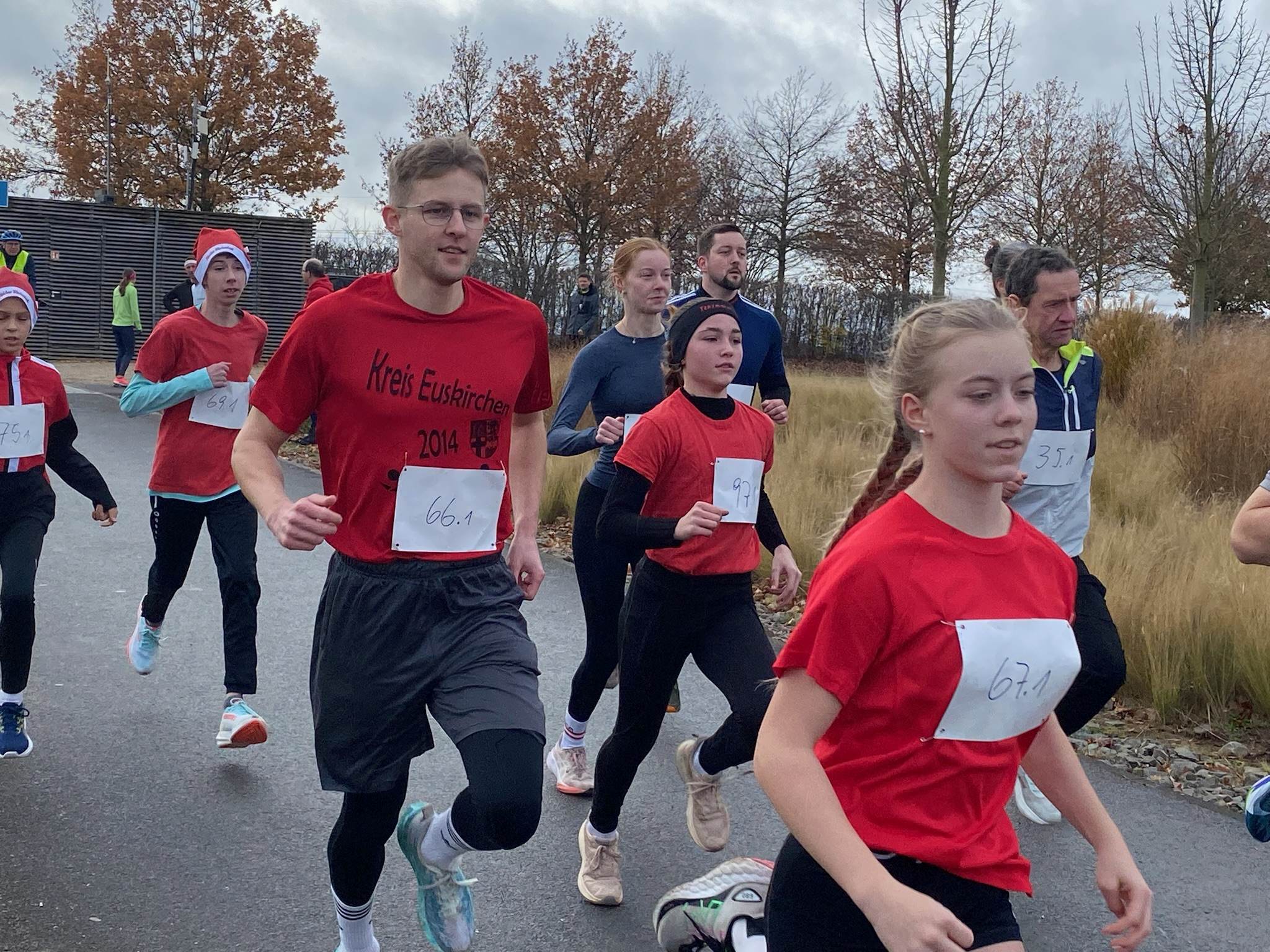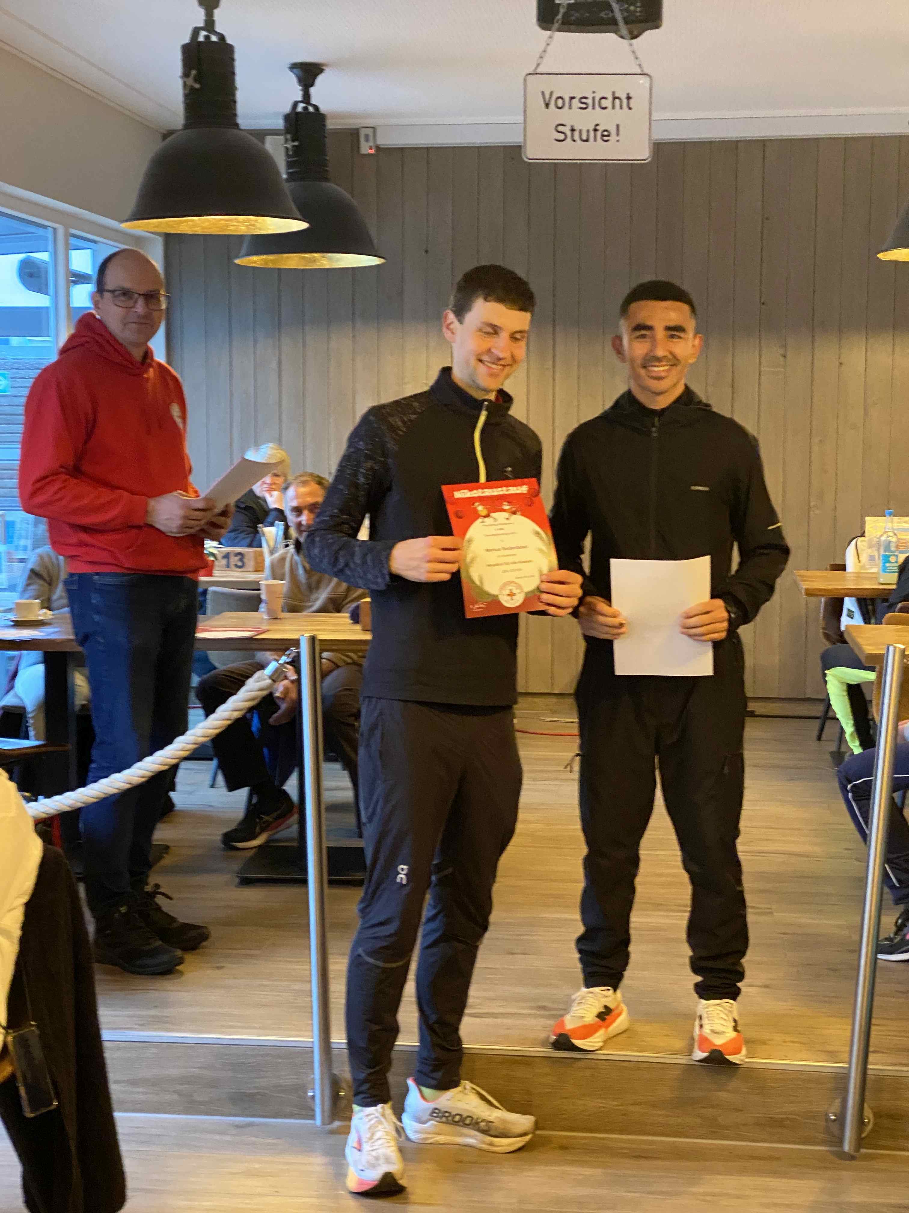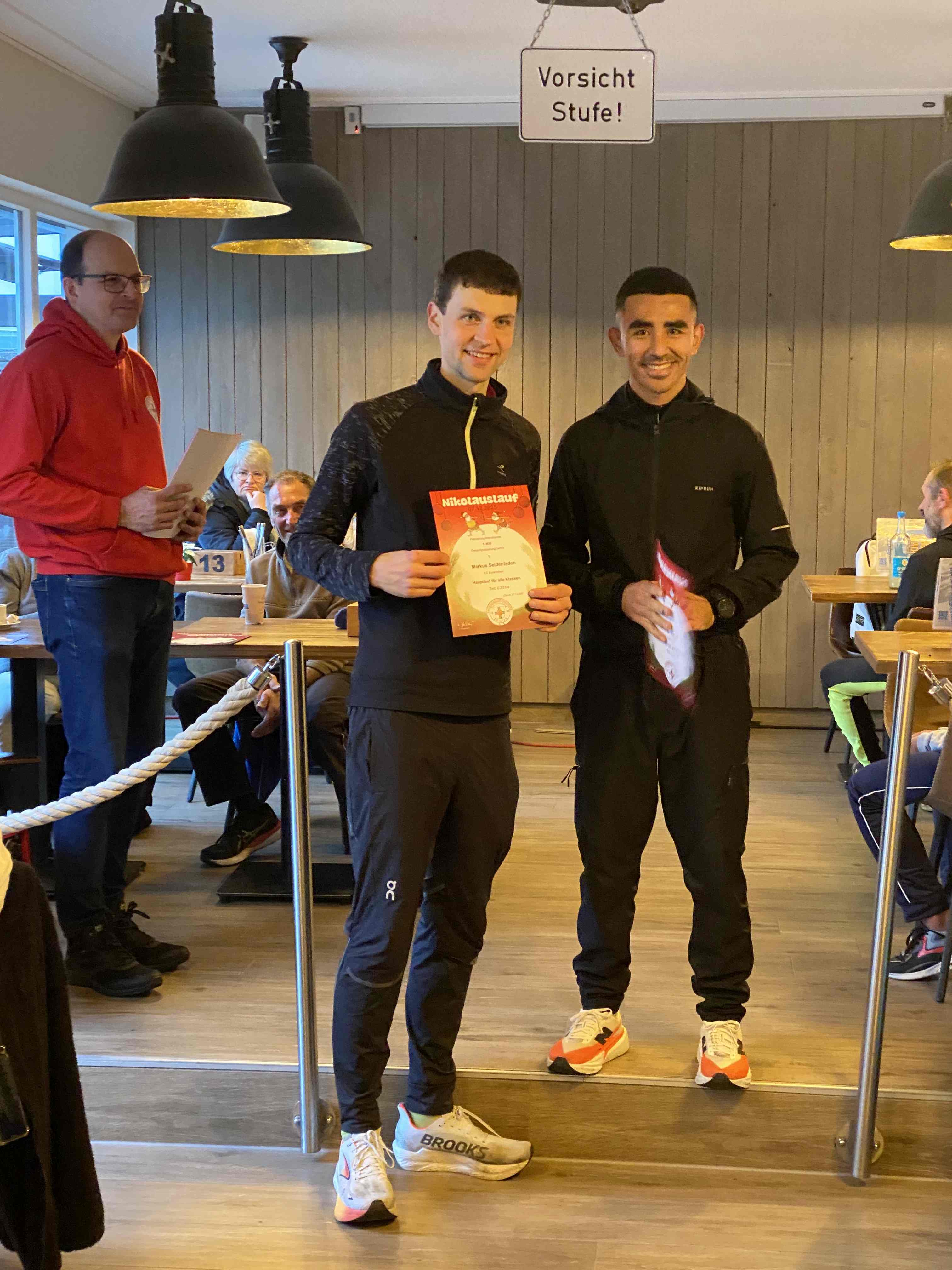 Den sportlichen Höhepunkt und zugleich den traditionellen Abschluss unseres Nikolauslaufs bildete der Hauptlauf über rund 9,5 Kilometer, der über eine kleine und vier große Runden führte. Bei den Frauen setzte sich Hannah Otten in 42:06 Minuten durch. Knapp dahinter folgte Clara Spiegel vom DLC Aachen, die in 42:19 Minuten als Zweite ins Ziel kam – bemerkenswert dabei, dass sie in der Altersklasse der B-Jugend startete. Den dritten Platz belegte Nicole Böwe vom TV Obermaubach, die der Altersklasse W45 angehört und nach 45:41 Minuten die Ziellinie überquerte. Bei den Männern sorgte Markus Seidenfaden (M30) für das sportliche Highlight des Tages und stellte mit 33:04 Minuten einen neuen Streckenrekord auf. Auf Rang zwei folgte sein Vereinskamerad vom LC Euskirchen und Vorjahressieger Ghafar Yusufi (ebenfalls M30), der mit 33:23 Minuten rund eine Minute schneller als im Vorjahr war. Dritter wurde Jan Vernikov, ein weiterer B-Jugendlicher, der die Strecke in 34:54 Minuten bewältigte.