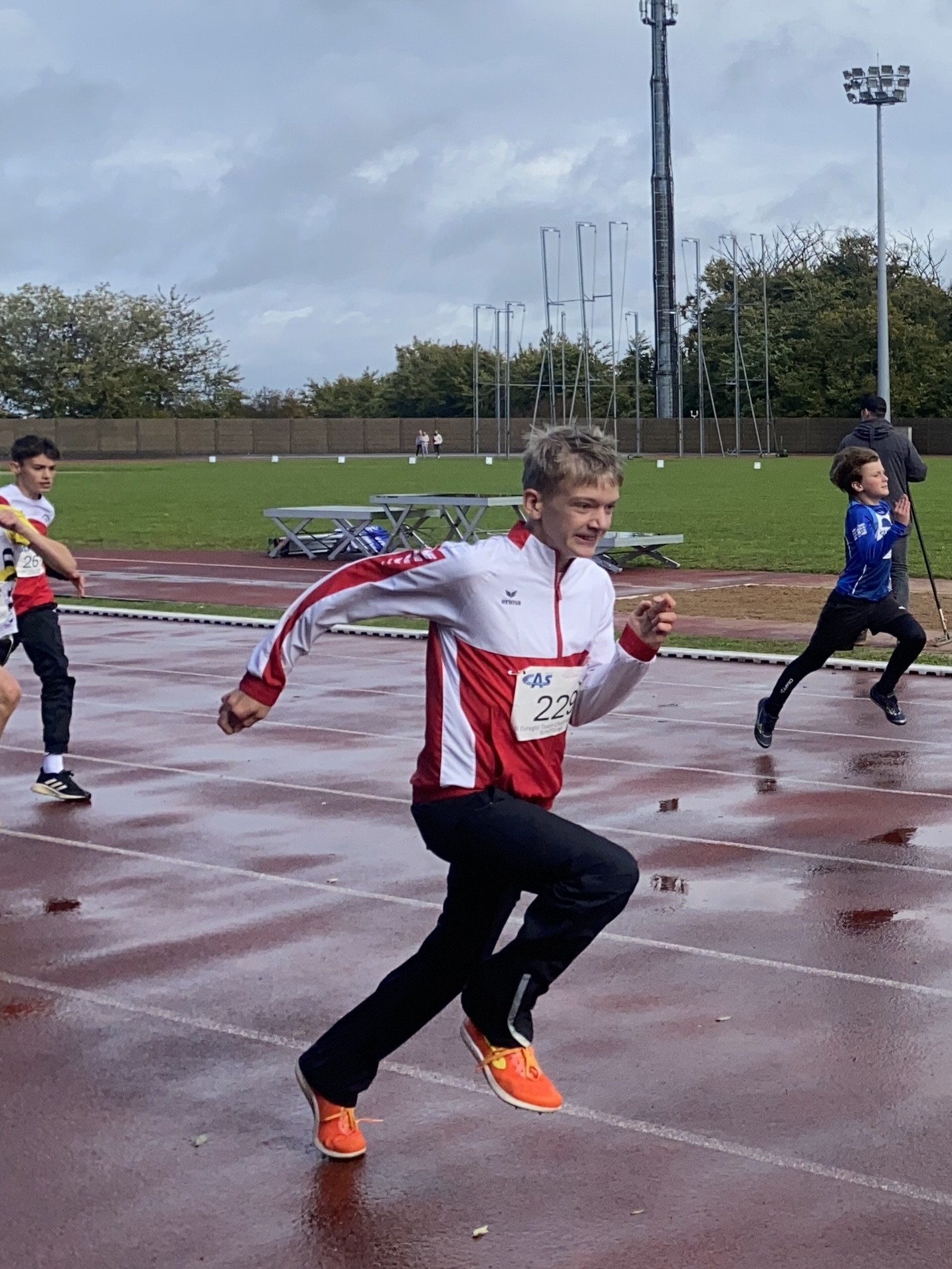 Etwas entspannter konnten die Jungs in ihren Wettkampf starten: Ihr Programm begann rund eine Stunde später, sodass eine ordentliche Aufwärmphase möglich war. Für die MJU14 ging es zunächst in den Hochsprung, wo Fabian Böser und Till Neumann jeweils 1,20 Meter meisterten – für Till bedeutete das eine neue Bestleistung. Sander Krantz überquerte 1,15 Meter. Im anschließenden 75-Meter-Lauf zeigte Fabian mit 11,07 Sekunden die schnellste Zeit des Trios, gefolgt von Till (12,33 s) und Sander (12,79 s). Über 800 Meter bewies Fabian erneut Stärke und erreichte in 2:38,79 Minuten exakt dieselbe Zeit wie Vereinskameradin Lisa. Till kam nach 3:10,87 Minuten und Sander nach 3:35,05 Minuten ins Ziel. Im abschließenden Kugelstoßen erzielte Fabian mit 7,83 Metern eine persönliche Bestleistung, während Till (4,31 m) und Sander (4,83 m) bei ihrem ersten Wettkampf in dieser Disziplin wertvolle Erfahrungen sammelten. In der Gesamtwertung belegte Fabian Böser mit 1.512 Punkten einen starken 4. Platz, Till Neumann mit 1.080 Punkten Rang 13 und Sander Kranz mit 978 Punkten Rang 16.