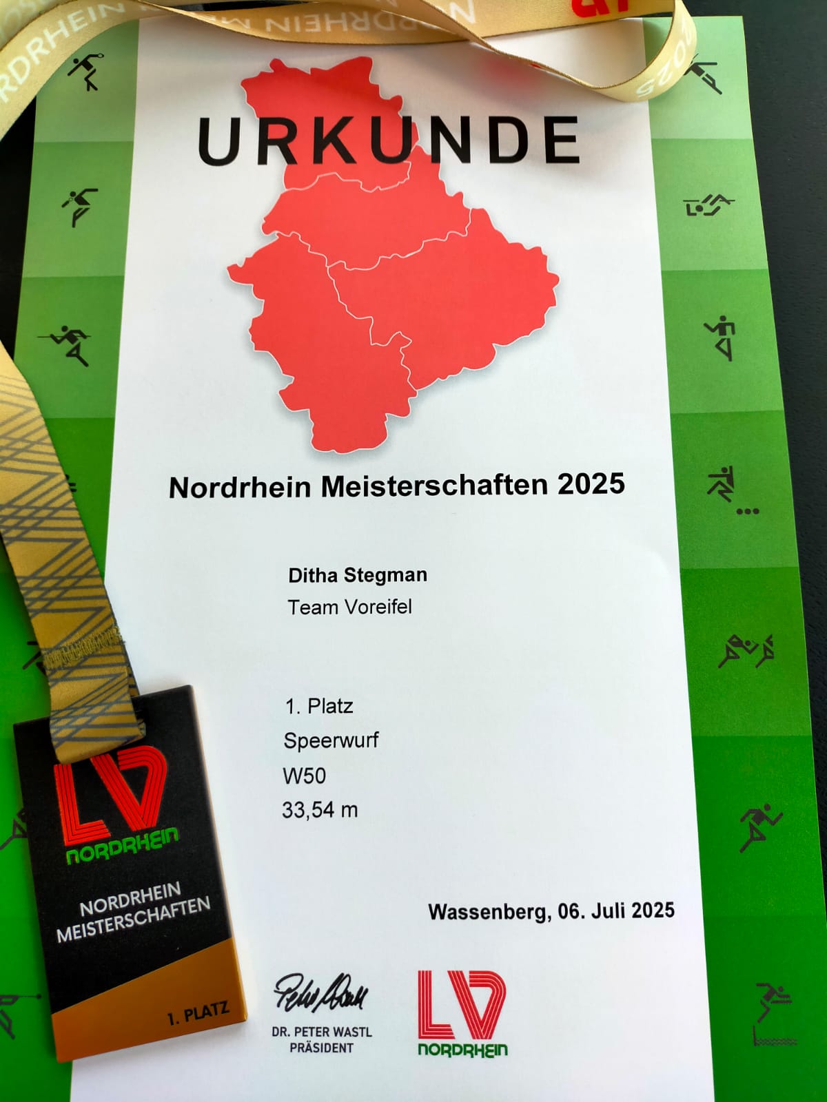 Mit 12 Medaillen – darunter 7 × Gold, 3 × Silber und 2 × Bronze – war das Team Voreifel bei den Nordrhein-Meisterschaften überaus erfolgreich. Michael Chavet war mit vier Titeln und einem zweiten Platz der überragende Athlet des Wochenendes. Seine Vielseitigkeit in Sprint, Sprung und Wurf war beeindruckend. Ebenfalls herausragend präsentierte sich Dr. Gerd Rüdiger Wasmuth, der in der Altersklasse M80 nicht nur mit zwei persönlichen Bestleistungen glänzte, sondern auch mit Gold und Silber ein sportliches Ausrufezeichen setzte. Und das unter erschwerten Bedingungen am Sonntag, an dem ständiger Regen zusätzliche Herausforderungen bot. Gemeinsam mit den weiteren starken Ergebnissen zeigt sich: Die Seniorinnen und Senioren des TuS Zülpich sind in Topform – und bringen sportliche Qualität und Leidenschaft gleichermaßen auf die Bahn und ins Feld.
