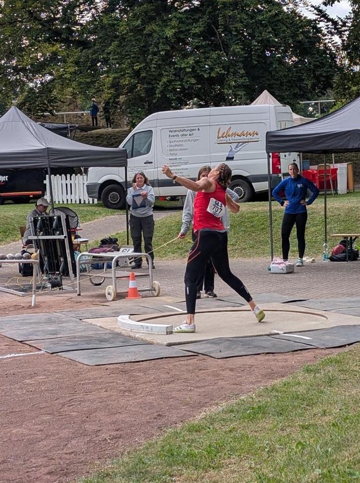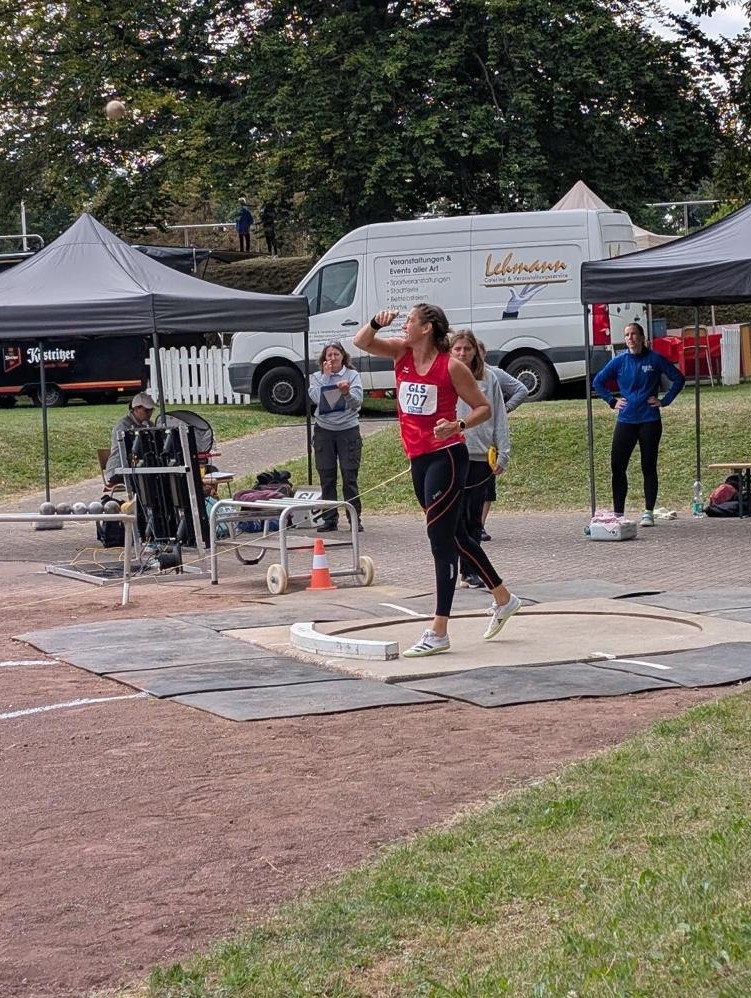 Besonders überzeugte dabei Caroline Hermann. Der Samstag begann bei ihrem Diskuswurf noch mit großem Pech. Drei ungültige Versuche bedeuteten das vorzeitige Aus ohne Wertung. Umso beeindruckender war ihre Reaktion im Kugelstoßen am Sonntag. Mit der 4-Kilogramm-Kugel fand Caroline zunächst nur schwer in den Wettkampf: Die ersten drei Versuche blieben unter der erhofften 11-Meter-Marke. Im vierten Durchgang gelang ihr mit 11,01 Metern endlich der Befreiungsschlag, der sie zunächst auf Platz vier brachte. Doch Caroline bewies weiterhin Nervenstärke. Im entscheidenden letzten Versuch steigerte sie sich noch einmal auf 11,14 Meter – ihre Tagesbestweite. Damit schob sie sich auf den Bronzerang und verdrängte eine Konkurrentin aus Düsseldorf auf den vierten Platz. Mit ihrer ersten Medaille bei Deutschen Meisterschaften in der Altersklasse W35 zeigte sich Caroline Hermann hochzufrieden.